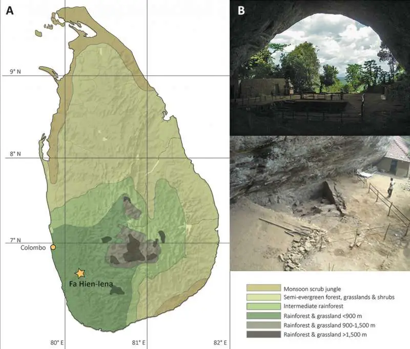Südlich des indischen Subkontinents liegt Sri Lanka. Die Insel im Indischen Ozean ist die Heimat der bislang ältesten Fossilien unserer Spezies, Homo Sapiens, in Südasien. Auf der Insel finden sich ebenfalls deutliche Indizien für eine menschliche Besiedelung und die Nutzung der tropischen Regenwaldgebiete außerhalb Afrikas von vor etwa 48.000 bis vor etwa 3.000 Jahren. Dies widerlegt die Annahme, dass diese angeblich ressourcenarmen Umgebungen lediglich Barrieren für die Ausbreitung des Menschen im Pleistozän waren. Die Frage, wie genau es den Menschen gelang, die Ressourcen des Regenwaldes– darunter „agile Nahrungsmittelquellen“ wie Affen und Eichhörnchen – zu nutzen, ist jedoch noch nicht beantwortet.