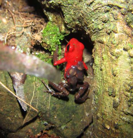Der auffällig rot-schwarz gefärbte und maximal 2 Zentimeter große Santander Pfeilgiftfrosch Andinobates virolinensis ist eine von vielen Amphibienarten, die nur in Kolumbien vorkommen. „Erstaunlicherweise haben wir diese endemische und als ‚gefährdet’ eingestufte Art ausschließlich in so genannten Schattenkaffeeplantagen gefunden“, erklärt Dr. Raffael Ernst von den Senckenberg Naturhistorischen Sammlungen Dresden und fährt fort: „Das ist insofern ungewöhnlich, weil diese Art eine spezialisierte Fortpflanzungsbiologie besitzt. Das Männchen transportiert den Quappennachwuchs auf dem Rücken zu geeigneten Aufzuchtgewässern, meist Bromelienblattachseln – und diese natürlichen Mikrohabitate sind in den bewirtschafteten Arealen eigentlich sehr limitiert.“
