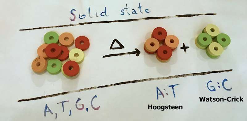 „Wir haben einen anderen Weg beschritten“, berichtet Ko-Autor Martin Etter von DESY. „Wir haben versucht herauszufinden, ob sich die Basenpaare durch mechanische Energie oder einfache Wärmezufuhr erzeugen lassen.“ Das Team untersuchte dazu die sogenannten methylierten Formen der Nukleinbasen. Die angehängte Methylgruppe (-CH3) erlaubt es den Nukleinbasen im Prinzip, Wasserstoffbindungen an der Watson-Crick-Seite des Moleküls auszubilden. Methylierte Nukleinbasen kommen auch in zahlreichen lebenden Organismus vor und haben dort verschiedene biologische Funktionen.