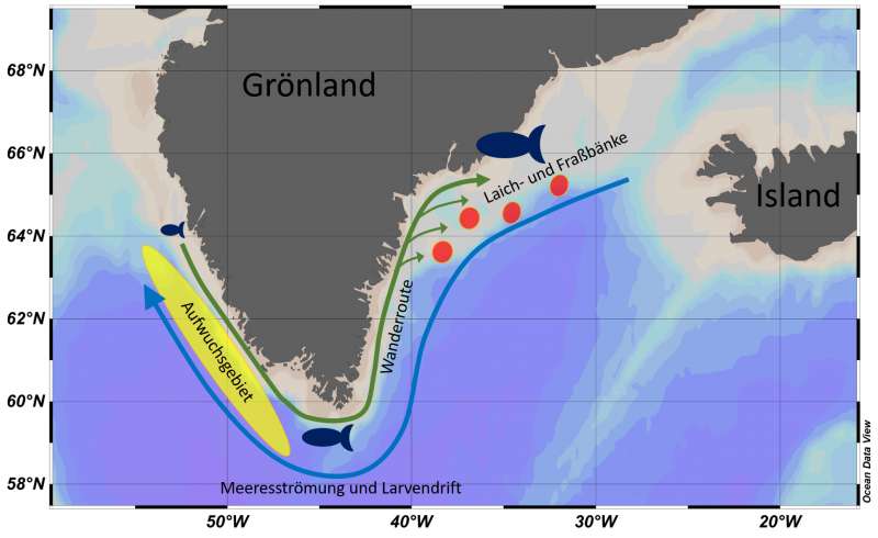 Der Schelfbereich um die Insel Grönland gehört zum Lebensraum des Kabeljaus, der in verschiedenen Beständen im gesamten Nord-Atlantik, der Nordsee und der Ostsee – dort Dorsch genannt – vorkommt. Der Grönland-Kabeljau hat einen komplexen Lebensyzklus: Die erwachsenen Fische laichen in Ostgrönland, von wo die Eier und Larven mit Meeresströmungen nach Süd- und Westgrönland transportiert werden (siehe Graphik). Hier wachsen die Jungfische auf und „hangeln“ sich dann im Laufe des Erwachsenwerdens zurück nach Ostgrönland, wo sie sich auf Unterwasserbänken sammeln, fressen und laichen. Deshalb findet man in Westgrönland hauptsächlich kleine, in Südgrönland mittelgroße und in Ostgrönland fast ausschließlich sehr große Kabeljaue.