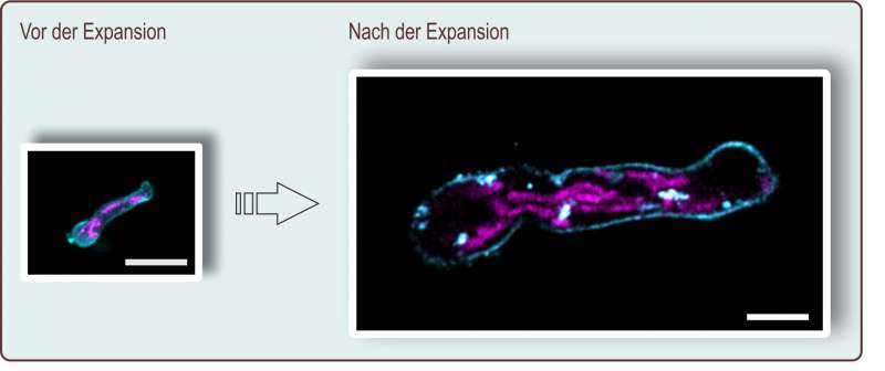 Die Vorgehensweise bei der ExM ist laut Terpitz recht einfach: Die gefärbte Pilzprobe wird in ein Polyacrylamid-Hydrogel eingebettet und die fluoreszierenden Farbstoffe im Hydrogel verankert. Nach der Zugabe von Wasser dehnt sich das Polymer wie ein Gummibärchen im Wasserglas aus. Dabei expandiert es auch die fluoreszierenden Farbstoffe in gleichmäßiger Weise.