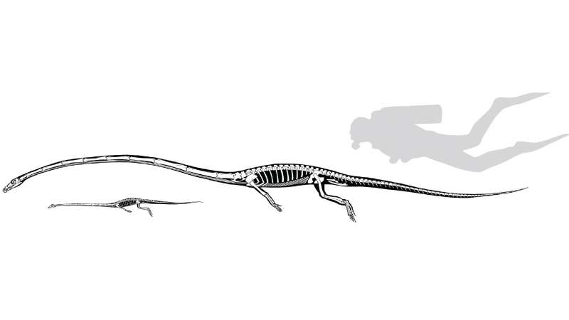 Sein Hals bestand aus dreizehn extrem verlängerten Wirbeln und war dreimal so lang wie sein Rumpf: Der Giraffenhalssaurier Tanystropheus lebte vor 242 Millionen Jahren und hat mit seinem bizarren Körperbau schon viele Paläontologen ins Grübeln gebracht. Ein internationales Forschungsteam unter der Leitung der Universität Zürich zeigt nun, dass das Reptil im Wasser lebte und überraschend anpassungsfähig war.