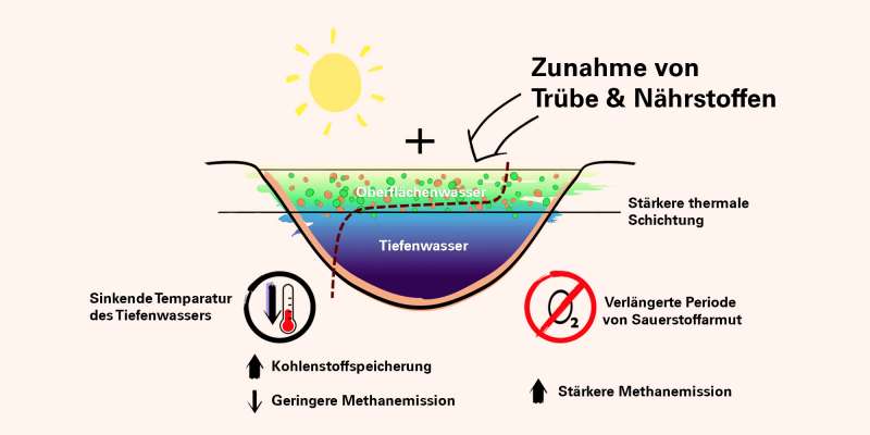 Durch die leichte Abkühlung verlangsamen sich die respiratorischen Abbauprozesse von Biomasse im See. Dadurch wird die Kohlenstoffspeicherung in den Sedimenten verstärkt, und die Kohlendioxidproduktion reduziert. Die auf Modellsimulationen beruhenden Ergebnisse deuten darauf hin, dass diese Effekte vor allem in relativ kleinen und flachen Seen von Relevanz sind. Diese machen einen Grossteil der globalen Seeoberfläche aus.