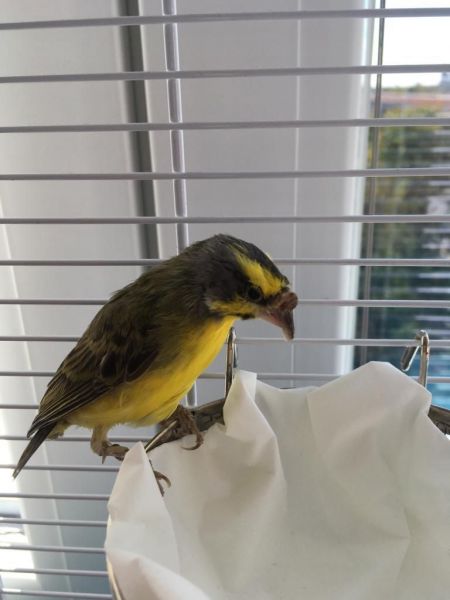 Krümel, so der Name dieses Mosambikgirlitzes, sitzt auf dem Rand eines Gefäßes. Krümel ist 21 Jahre alt und somit möglicherweise der älteste Vogel seiner Art.