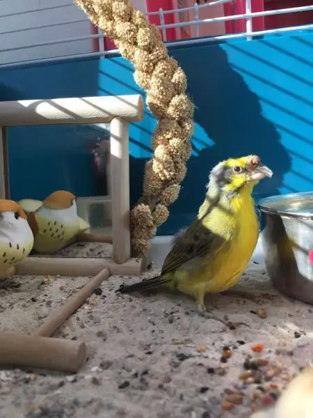 Krümel, so der Name dieses Mosambikgirlitzes, in seinem Heim. Krümel ist 22 Jahre alt und somit möglicherweise der älteste Vogel seiner Art.