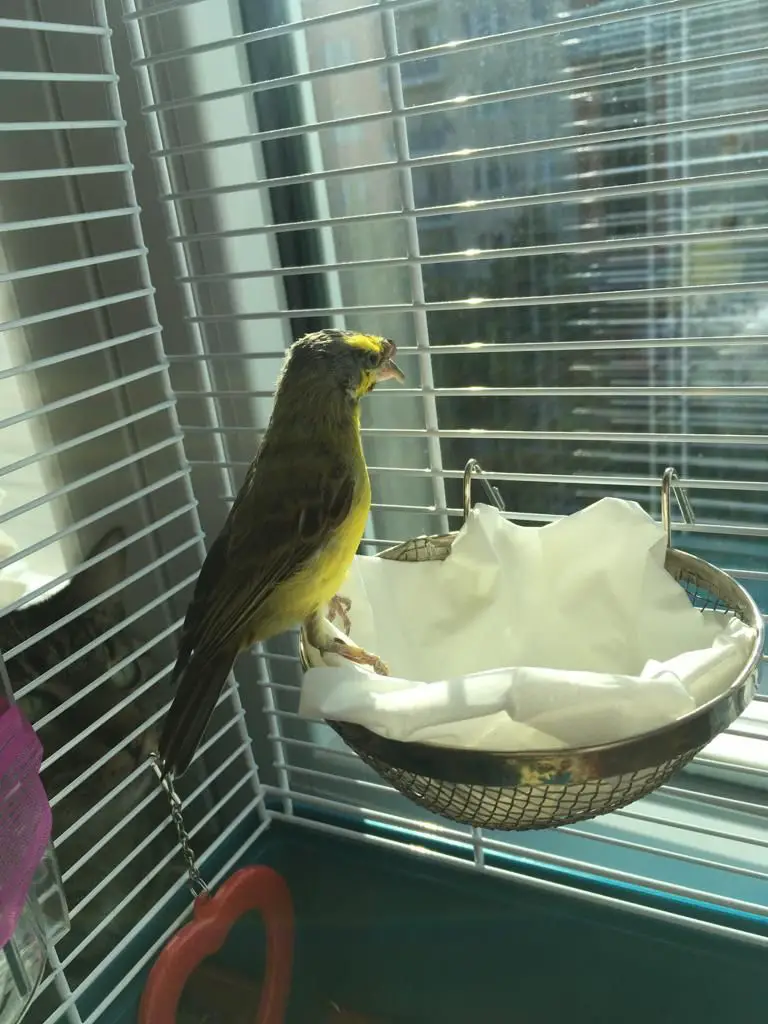 Krümel, so der Name dieses Mosambikgirlitzes, sitzt auf dem Rand eines Gefäßes. Krümel ist 21 Jahre alt und somit möglicherweise der älteste Vogel seiner Art.