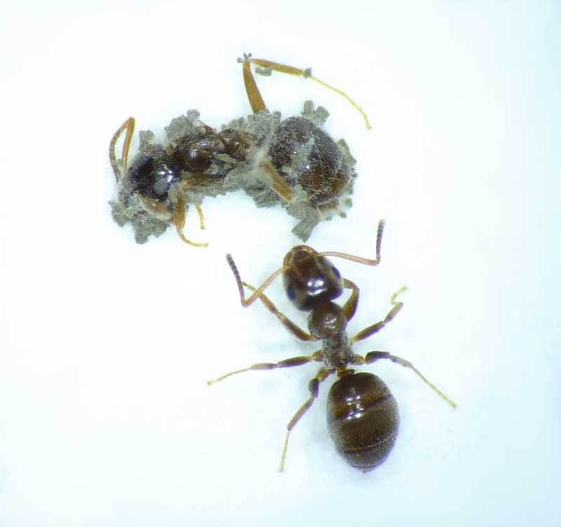 In den Experimenten untersuchten die Forschenden Argentinische Ameisen (Linepithema humile), welche mit dem pathogenen Metarhizium-Pilz infiziert wurden, und dann entweder in Anwesenheit oder in Abwesenheit von pflegenden Koloniemitgliedern gehalten wurden. „Als Reaktion auf die Pflege der Ameisenarbeiterinnen haben sich die Pilze grundlegend verändert“, so Milutinović weiter. Über zehn Infektionszyklen hinweg steigerten jene Pilze, die von pflegenden Nestgenossinnen betreut wurden, ihre Sporenproduktion im Vergleich zu Pilzen, die nur von einzelnen Ameisen begleitet wurden. Sylvia Cremer ergänzt: „Die erhöhte Sporenproduktion hilft dem Pilz, der sozialen Sporenentfernung entgegenzuwirken. Überraschend war jedoch, dass die Ameisen plötzlich weniger der Sporen abputzten. Das deutet darauf hin, dass sie die Sporen nicht mehr so leicht erkannt haben.“