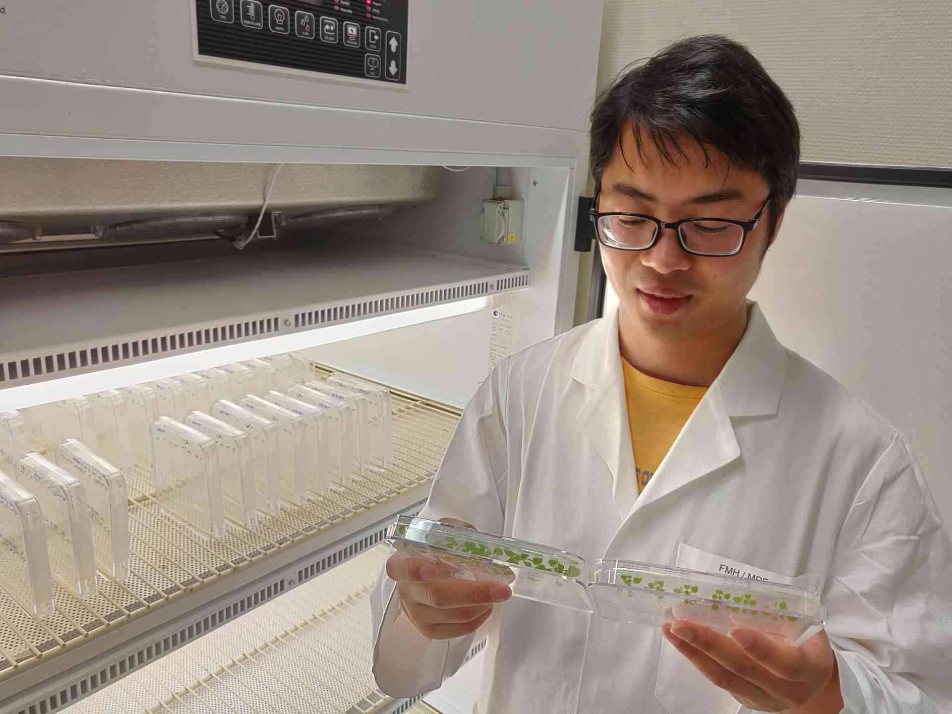 Zhongtao Jia bei der Begutachtung der Wurzelantwort seiner Arabidopsispflanzen.