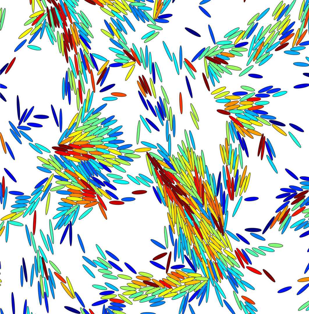 Bakterien (dargestellt als Ellipsen) organisieren sich als Schwärme, wenn sie sich über Oberflächen bewegen. Jedes Bakterium ist entsprechend seiner Geschwindigkeit eingefärbt, wobei schnelle Bakterien rot dargestellt sind und langsame Bakterien blau.