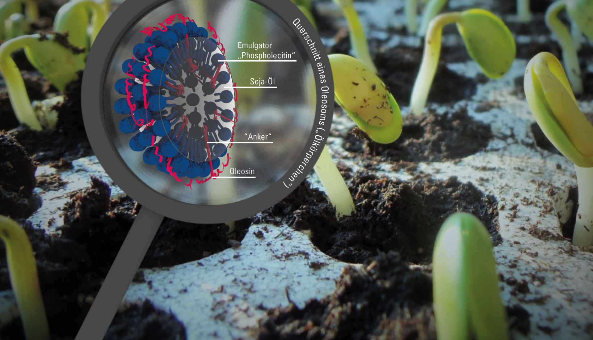 Wasser und Öl vermischen sich nicht – dies ist eine Erfahrung des täglichen Lebens. Um Wasser mit Öl zu mischen bedarf es sogenannter „Emulgatoren“. Ein solcher ist das ebenfalls in der Sojapflanze vorliegende Molekül „Lecithin“ (ein Phospholipid): Das langkettige Molekül besitzt einen wasserliebenden sowie einen wasserabweisenden (und damit fettliebenden) Teil. Das Molekül ordnet sich um Öltröpfchen herum an und schließt diese im Inneren einer Kugel ein. Der fettliebende Teil schaut hierbei nach innen zum Öl. Da das Molekül nach außen hin wasserliebend ist, können also kleine Ölkörperchen – bestehend aus der Emulgatorhülle sowie dem öligen Inneren – in Wasser gelöst werden. Diese Ölkörperchen nennen sich Oleosome.