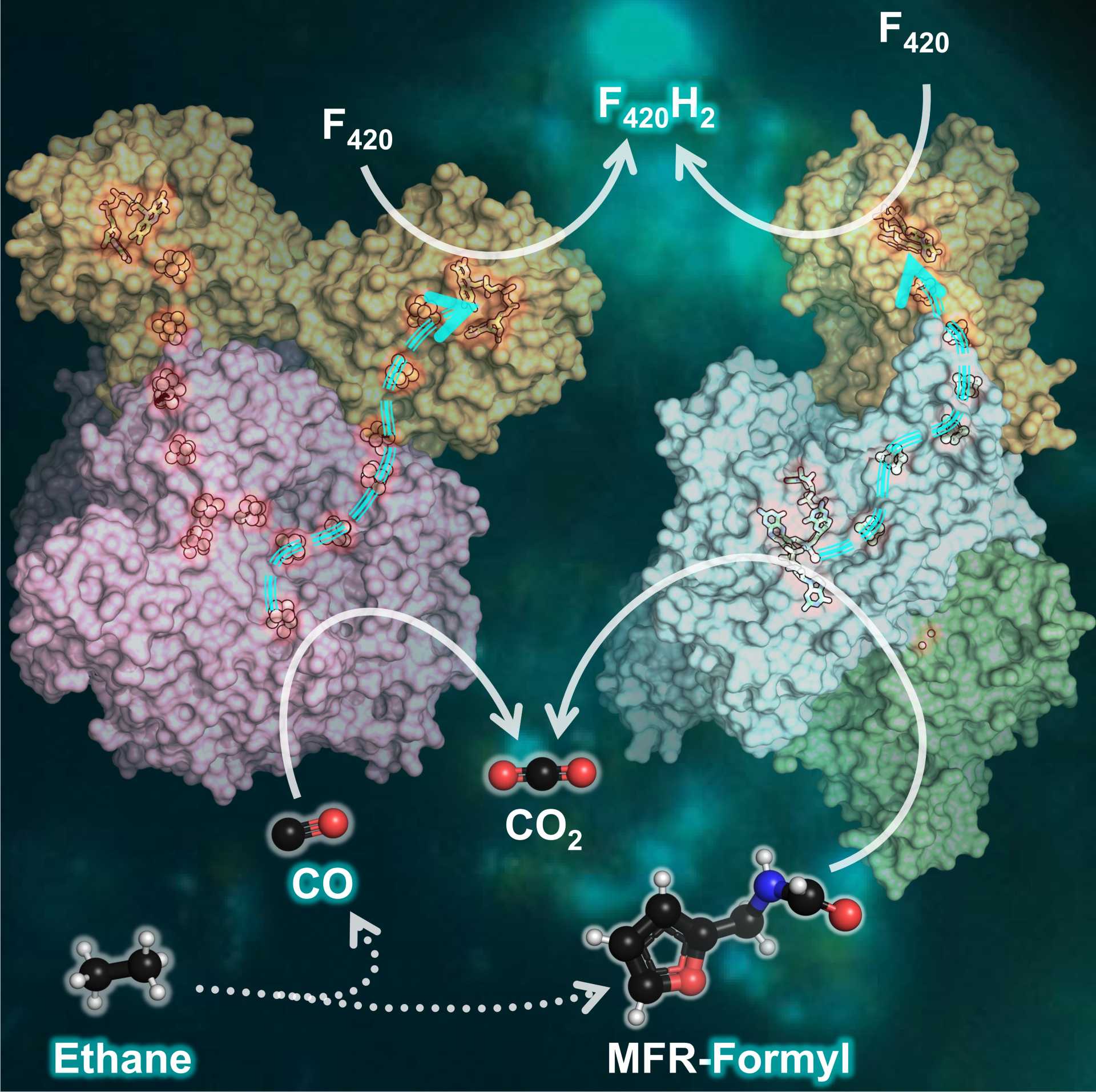 Die jetzt veröffentlichten Analysen zeigen, dass beide Enzyme ein zusätzliches Protein enthalten, das mit dem Rest des Enzyms über eine Redoxkette von Eisen- und Schwefelatomen elektronisch verbunden ist. Durch diese Untereinheit wird es möglich, einen alternativen Elektronenakzeptor zu verwenden: Das F420, ein Molekül auf der Basis von Flavin, einer Klasse von Chemikalien, die auch für den Menschen wichtig ist (z.B. als Vitamin B2).