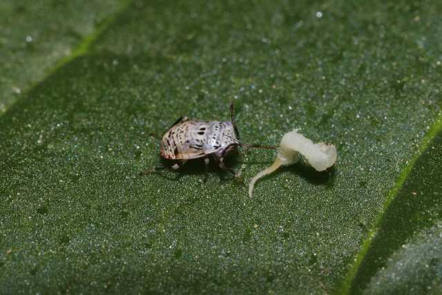 Die Nymphe einer Geocoris-Wanze attackiert eine winzige Tabakschwärmerraupe, die gerade erst aus dem Ei geschlüpft ist.