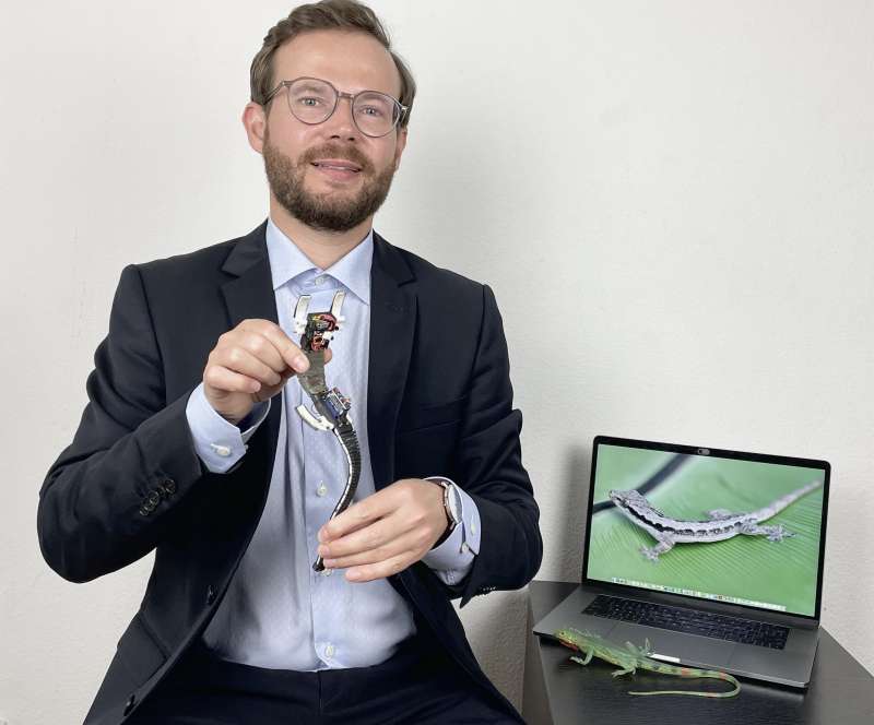 Wie kann man jedoch schlüssig nachweisen, dass der Schwanz diese stabilisierende Wirkung hat? Dieser Fragestellung gingen die Wissenschaftler im Labor nach und schufen ein physikalisches Modell, um die Kräfte, denen das Tier ausgesetzt ist, besser zu verstehen. Dazu kreierten sie einen Gecko-inspirierten Roboter: Dieser verfügt über einen weichen Rumpf, bei dem der Schwanz abgenommen und wieder montiert werden kann. Wenn der vordere „Fuß“ auf eine Oberfläche aufprallt, ist der Roboter so programmiert, dass er seinen Schwanz biegt, vergleichbar mit den Reflexen, die Jusufi zuvor bei kletternden Geckos entdeckt hat. Die Informationen werden über einen Mikrocontroller an der „Schulter“ verarbeitet, um sogleich einen Motor im „Becken“ zu aktivieren, der an einer „Sehne“ zieht und so den Schwanz gegen die Wand drückt, um den Roboter zu stabilisieren.