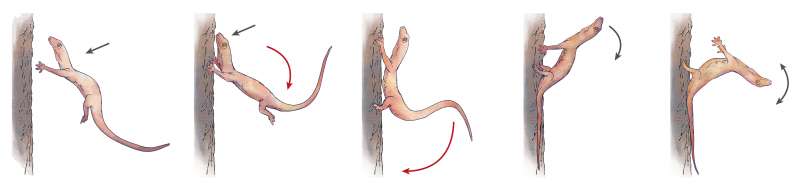 Wie in diesem Video zu sehen ist, federt das Tier den Aufprall ab, indem es seinen Rumpf um bis zu 100 Grad nach hinten beugt. Bei dieser Beugung verlieren die Vorderfüße den Halt, nur die Hinterbeine bleiben haften. Durch diese Rückwärtsneigung des Rumpfes wird Energie abgeleitet, indem der Schwanz gegen den Baumstamm gedrückt wird. Tiere, die ihren Schwanz jedoch verloren haben, können die Energie nicht genügend abfedern und fallen vom Stamm. Die Vermutung der Forschenden: Der Schwanz wirkt also wie ein fünftes Bein und hilft dem Gecko, sich nach dem Aufprall zu stabilisieren.