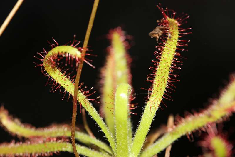 Die Gattung Drosera, Sonnentau, stellt weltweit die größte Gruppe von fleischfressenden Pflanzen dar und umfasst etwas mehr als 250 Arten. Die meisten davon kommen auf der Südhalbkugel vor, insbesondere in Australien, Südafrika und Brasilien. Sonnentau-Pflanzen haben Blätter, die dicht mit karnivoren Drüsen, sogenannten Tentakeln, besetzt sind, die klebrige Schleimtröpfchen ausscheiden. Diese glitzernden Tröpfchen auf den meist leuchtend roten Tentakeln sind wirkungsvolle, attraktive und doch tödliche Lockfallen für kleine Tiere, insbesondere fliegende Insekten.