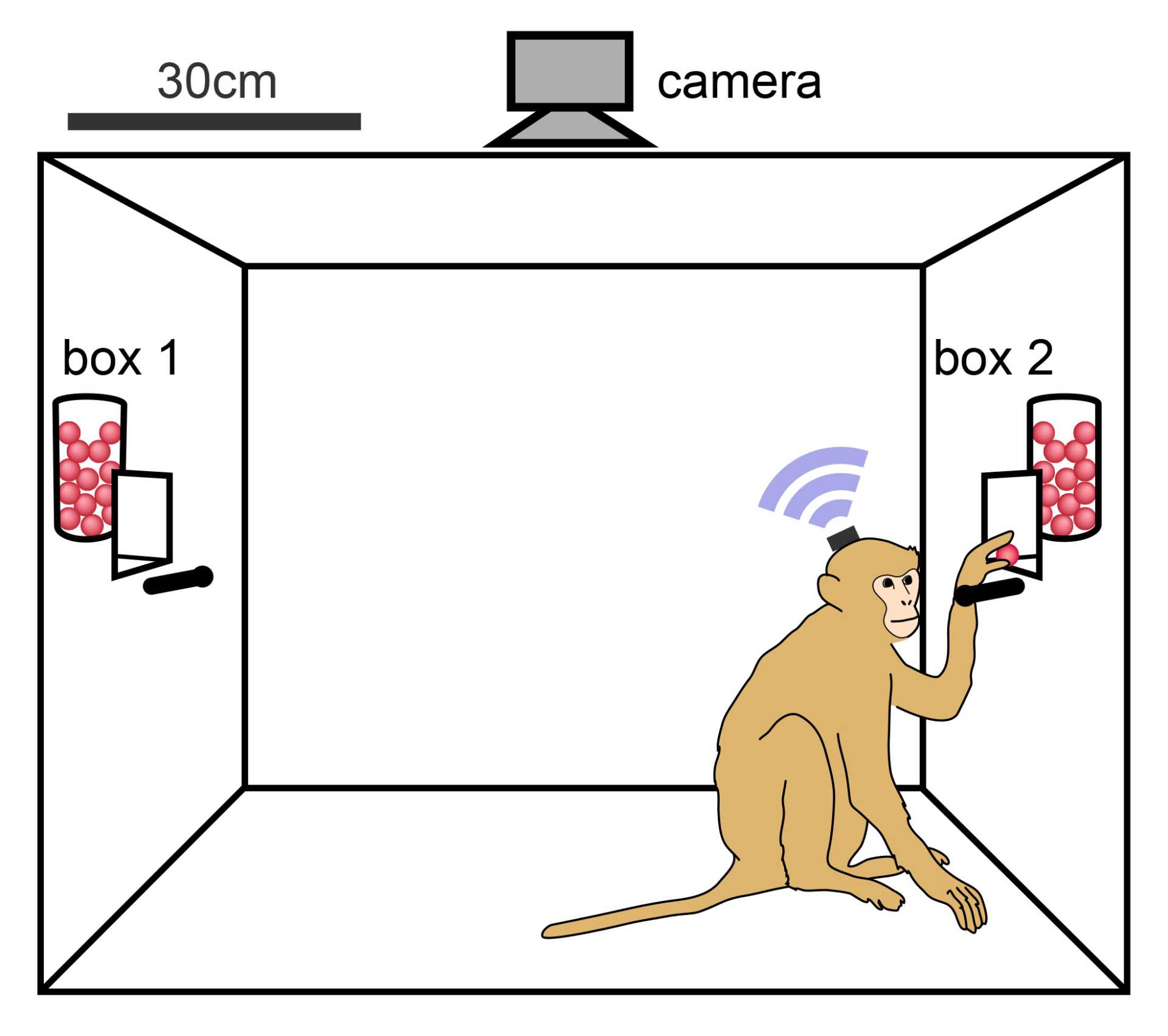 Die Tiere konnten sich frei bewegen und aus zwei Futterboxen durch Knopfdruck Futterpellets erhalten. Im Versuchsverlauf lernten die Affen, dass sich die Menge der ausgegebenen Pellets aus den Boxen erhöhte, je länger sie bis zum nächsten Knopfdruck warteten. Wurden sie nach Drücken des Knopfes nicht mit Pellets belohnt, warteten die Affen beim nächsten Mal länger oder wechselten zu der anderen Box.