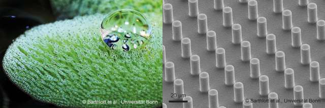 Die HighTech-Schichten sind Vorbildern aus der Natur nachempfunden, etwa dem Schwimmfarn Salvinia molesta. Dieser ist extrem wasserscheu: Taucht man ihn unter und zieht ihn wieder heraus, perlt die Flüssigkeit sofort von ihm ab. Danach ist er komplett trocken. Oder richtiger: Er war nie wirklich nass. Denn unter Wasser hüllt sich der Farn in ein hauchdünnes Kleid aus Luft. Es verhindert, dass die Pflanze mit Flüssigkeit in Kontakt kommt – selbst bei einem wochenlangen Tauchgang. Wissenschaftler nennen dieses Verhalten „superhydrophob“.