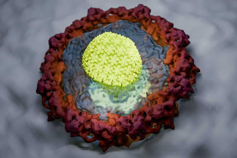 „HIV verpackt sein Genom in eine große kegelförmige Struktur, das sogenannte Kapsid. Neuere Experimente deuten darauf hin, dass das virale Erbgut dort verbleibt, bis es die Kernpore passiert hat und im Kern angekommen ist. Dabei gibt es aber ein Größenproblem“, sagt Thomas Schwartz vom MIT. Das HIV-Kapsid ist etwa 60 Nanometer (millionstel Millimeter) breit. Der Durchmesser des Kernporenkanals beträgt 40 bis maximal 60 Nanometer. Damit könnte sich das Kapsid allein gerade noch so durch die Kernpore zwängen. Würde es aber wie normale Zellfracht transportiert, müsste es noch von einer Transporter-Schicht umhüllt sein, die mindestens weitere zehn Nanometer misst. Mit dieser Schicht wäre das HIV-Kapsid 70 Nanometer breit – zu groß für eine Kernpore. „Von elektronenmikroskopischen Untersuchungen wissen wir aber, dass das HIV-Kapsid dennoch in das Innere einer Kernpore gelangt. Wie es dort hineinpasst, war bisher ein ungelöstes Rätsel“, erklärt Max-Planck-Direktor Görlich.