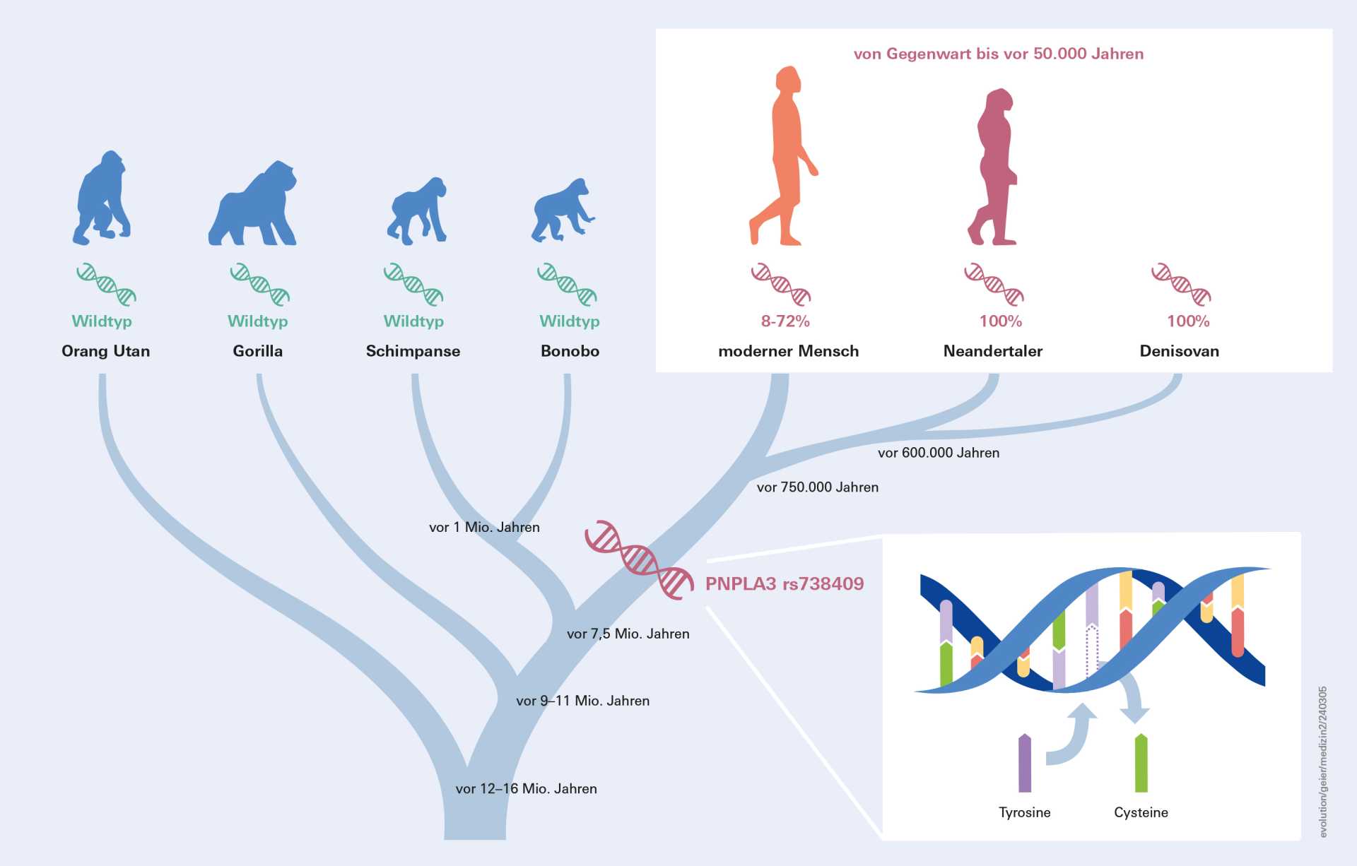 „Überraschenderweise trugen alle archaischen Menschen, die vor 40.000 bis 65.000 Jahren lebten, ausschließlich das Risiko-Allel, was auf eine Fixierung des Varianten-Allels bei ihren gemeinsamen Vorfahren hindeutet“, erklärt Andreas Geier und geht im menschlichen Stammbaum noch weiter zurück. „Bei der Analyse der Referenzgenomsequenz von Primaten wurde deutlich, dass die Menschenaffen, vom Orang-Utan über Gorilla bis zum Schimpansen und Bonobo, eine ursprüngliche, weniger riskante Genvariante tragen, einen sogenannten Wildtyp.“