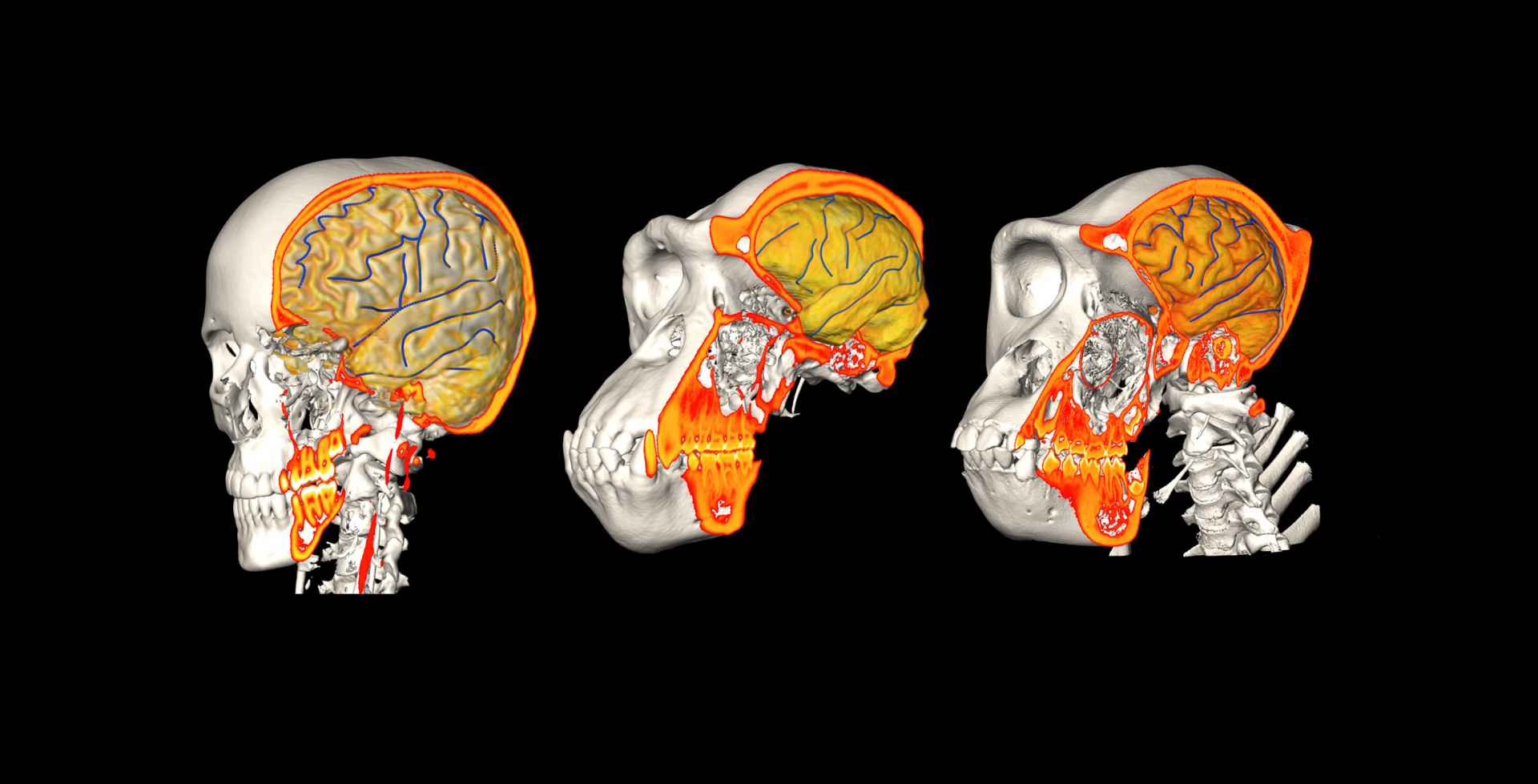 CT/MRI-Daten eines Menschen (links), eines Schimpansen (Mitte) und eines Gorillas (rechts).