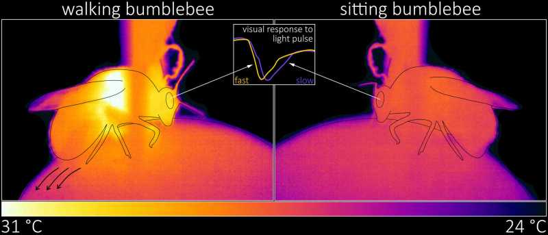 Hummeln sind in der Lage ihre Körpertemperatur aktiv zu erhöhen und beschleunigen damit auch den Ablauf biochemischer Prozesse. Dazu zittern sie mit ihrer Flugmuskulatur. Gleichzeitige Messung der Temperatur und der Reaktionsgeschwindigkeit des Auges deutete darauf hin, dass der beobachtete Zugewinn an Reaktionsgeschwindigkeit eine Folge erhöhter Körpertemperatur sein könnte. „Dass dies tatsächlich der Fall ist, konnten wir nachweisen, indem wir sitzende Tiere mit einer Wärmelampe bestrahlten und die Ergebnisse so reproduzierten“, erklärt Lisa Rother. Die Doktorandin ist, gemeinsam mit Robin Müller, Erstautorin der Studie.