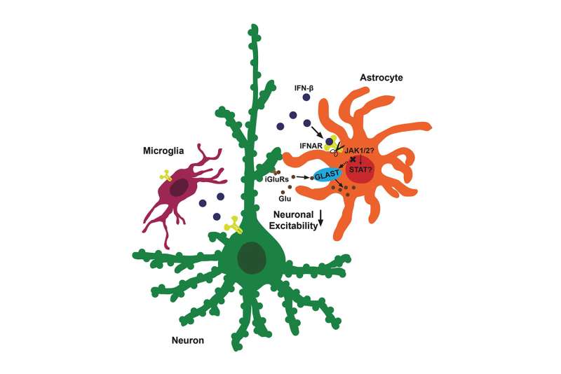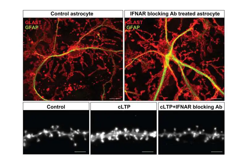 Wie aber beeinflusst das Interferon das Lern- und Erinnerungsvermögen der Mäuse? Im Hippocampus wird bei Gedächtnisprozessen der Neurotransmitter Glutamat ausgeschüttet, der als Botenstoff die Erregung von einer Nervenzelle auf eine andere überträgt. Die Astrozyten pumpen das Glutamat weg, damit ein nächster Impuls eine neue Wirkung auf die Rezeptoren haben kann. Die Wissenschaftlerinnen und Wissenschaftler haben mithilfe der Mausmodelle herausgefunden, dass der Interferon-Rezeptor auf den Astrozyten wichtig ist, um den Abtransport des Glutamats zu beeinflussen. Das Typ I Interferon bestimmt nämlich, wie schnell das Glutamat abtransportiert wird. Wird es beispielsweise langsamer weggepumpt, hat es eine längere und damit stärkere Wirkung. Dadurch können sich Lernereignisse besser manifestieren. Fehlen die Interferon-Rezeptoren, fehlt die Regulation des Glutamatabtransportes und Gedächtnisprozesse kommen aus dem Gleichgewicht.