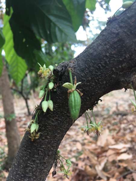- Und zuletzt: Wenn Kakaobäume im Schatten anderer Pflanzen wachsen, und fliegende Insekten besuchen die bluten, erhöht das ebenfalls den Fruchtansatz und damit – im Idealfall – den Ertrag.