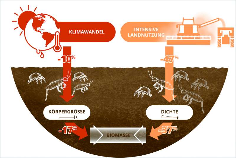 Weitgehend unbeachtet und im Verborgenen arbeitet unter unseren Füßen ein Heer von winzigen Dienstleistern. Unzählige kleine Insekten, Spinnentiere und andere Bodenbewohner sind unermüdlich damit beschäftigt, abgestorbene Pflanzen und anderes organisches Material zu zersetzen und die darin enthaltenen Nährstoffe zu recyceln. Schon lange aber befürchten Fachleute, dass diese für die Bodenfruchtbarkeit und die Funktionsfähigkeit der Ökosysteme so wichtigen Organismen zunehmend unter Stress geraten. Wissenschaftler haben jetzt festgestellt, dass die Zahl der kleinen Tiere, die dort Pflanzen zersetzen und damit die Fruchtbarkeit des Bodens erhalten, sowohl durch den Klimawandel als auch durch eine zu intensive Bewirtschaftung abnimmt. Dies kommt auf zwei unterschiedlichen Wegen zustande: Während das veränderte Klima die Körpergröße der Organismen reduziert, verringert die Bewirtschaftung ihre Häufigkeit. Selbst mit Biolandwirtschaft lassen sich demnach nicht alle negativen Folgen des Klimawandels abpuffern.