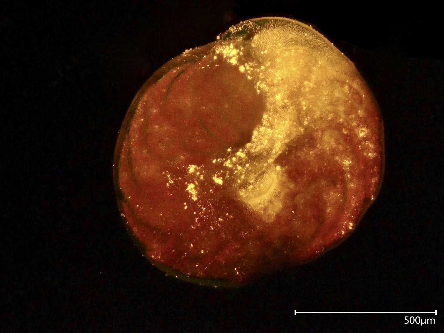 Mit einem Fluoreszenzmikroskop konnten die Forscherinnen und Forscher eine große Anzahl von gelb leuchtenden Nanoplastikpartikeln in den Foraminiferen beobachten. Zwar stieß ein Teil der Einzeller nach den Futterversuchen das Plastik wieder ab, doch rund die Hälfte der Foraminiferen behielt die Plastiklast im Zellinneren.