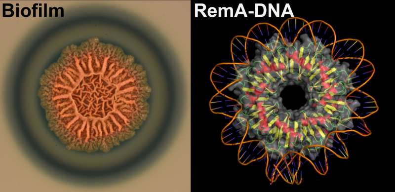 Um die Entstehung gewebeartiger Strukturen zu steuern – sogenannter Biofilme –, bildet das Protein RemA einen Ring, um den sich die DNA wickelt. Ein Team aus der Marburger Biologie und Chemie beschreibt diese Entdeckung in einem Wissenschaftsmagazin.