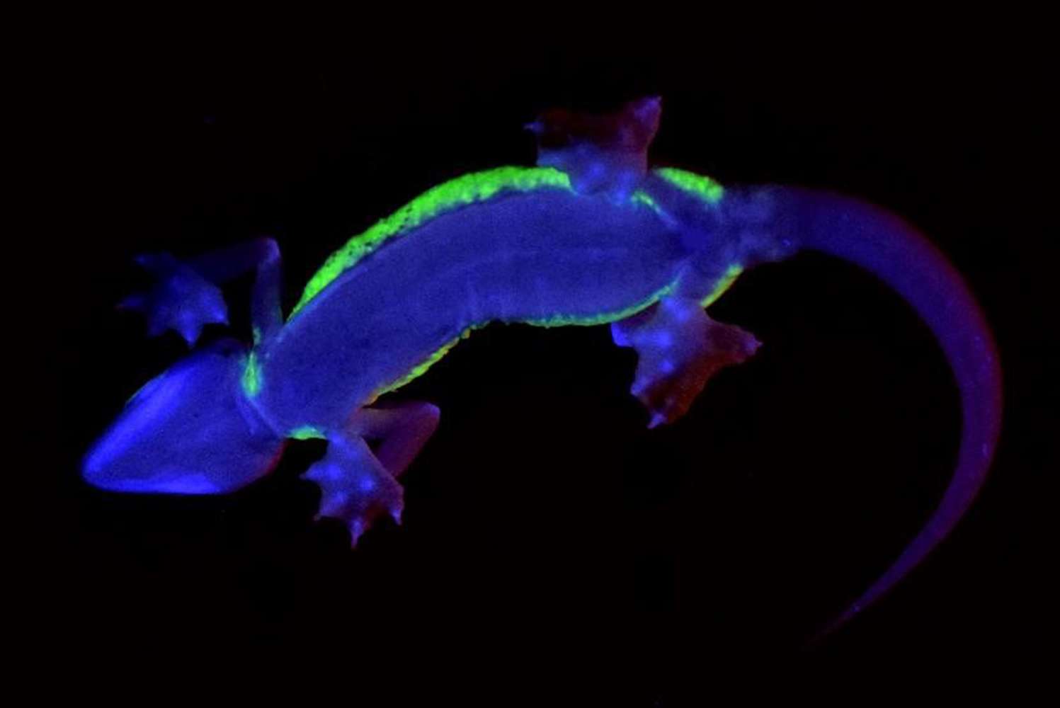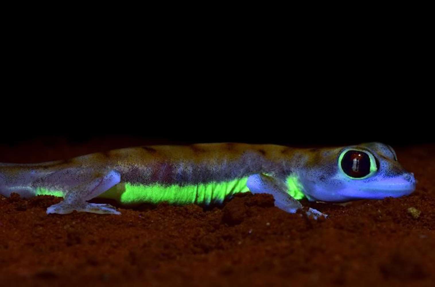 Forschende der Zoologischen Staatssammlung München (SNSB-ZSM), der LMU und der Hochschule München haben entdeckt, dass der Wüstengecko Pachydactylus rangei aus Namibia unter UV-Licht stark neon-grün fluoreszierende Streifen an den Körperseiten und um die Augen zeigt. Diese sind aus der Geckoperspektive gut sichtbar und dienen vermutlich als Erkennungssignal für Artgenossen. Die Wissenschaftler konnten zeigen, dass es sich hier um Fluoreszenz der Haut handelt, die durch besondere Iridophoren (Pigmentzellen) verursacht wird. Dieser Mechanismus und auch die Stärke der Fluoreszenz waren bisher bei Landwirbeltieren unbekannt. Die Arbeit erschien heute in dem Fachjournal Scientific Reports.