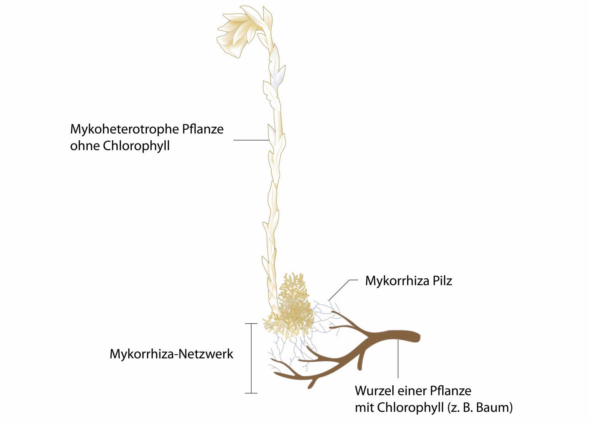 Vollständig mykoheterotroph lebende Pflanzen sind meist klein und werden am Waldboden schnell übersehen. Sie liefern allerdings den entscheidenden Nachweis für die Bedeutung des „Wood Wide Web“: Sie besitzen keine grünen Blätter und können somit keine Photosynthese betreiben, weshalb sie sich vollständig auf Kosten der Mykorrhiza-Pilze ernähren. Diese Pilzpartner gehen gleichzeitig eine zweite Partnerschaft mit Waldbäumen ein und können einen Kohlenstoffaustausch zwischen den Pflanzen vermitteln. „Damit belegen die vollständig mykoheterotrophen Pflanzen die Existenz von Mykorrhiza-Netzwerken, an denen mindestens drei Partner – zwei Pflanzen und ein Pilz – beteiligt sind“, so Gebauer.