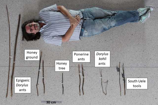 "Über einen Zeitraum von zwölf Jahren haben wir Schimpansenwerkzeuge und -gegenstände in 20 Studiengebieten dokumentiert und Daten über Kot, Fütterungsreste und Schlafnester der Tiere gesammelt", sagt Hauptautor Thurston C. Hicks, Gastforscher am Max-Planck-Institut für evolutionäre Anthropologie und außerordentlicher Professor an der Fakultät „Artes Liberales“ der Universität Warschau. "Wir beschreiben ein neues Schimpansen-Werkzeugset: Lange Stöcke zum Sammeln von epigäischen Treiberameisen (Dorylus sp.), kurze Stöcke zum Sammeln von Stechameisen (Ponerinae) und zum Sammeln von Honig aus den Baumnestern stachelloser Bienen, dünne kurze Stöcke zur Extraktion von Ameisen der Art Dorylus kohli und stabile Stöcke, die die Tiere verwenden, um die unterirdischen Nester stachelloser Bienen zu erreichen."