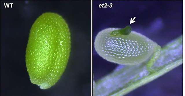 Samen mit verfrühter Keimung: Während normalen Samen (WT-Wildtyp) in der Samenruhe verharren, zeigt sich in den Samen ohne ET-Funktion (et2-3) eine verfrühte Keimung, zum Teil noch in der Schote.