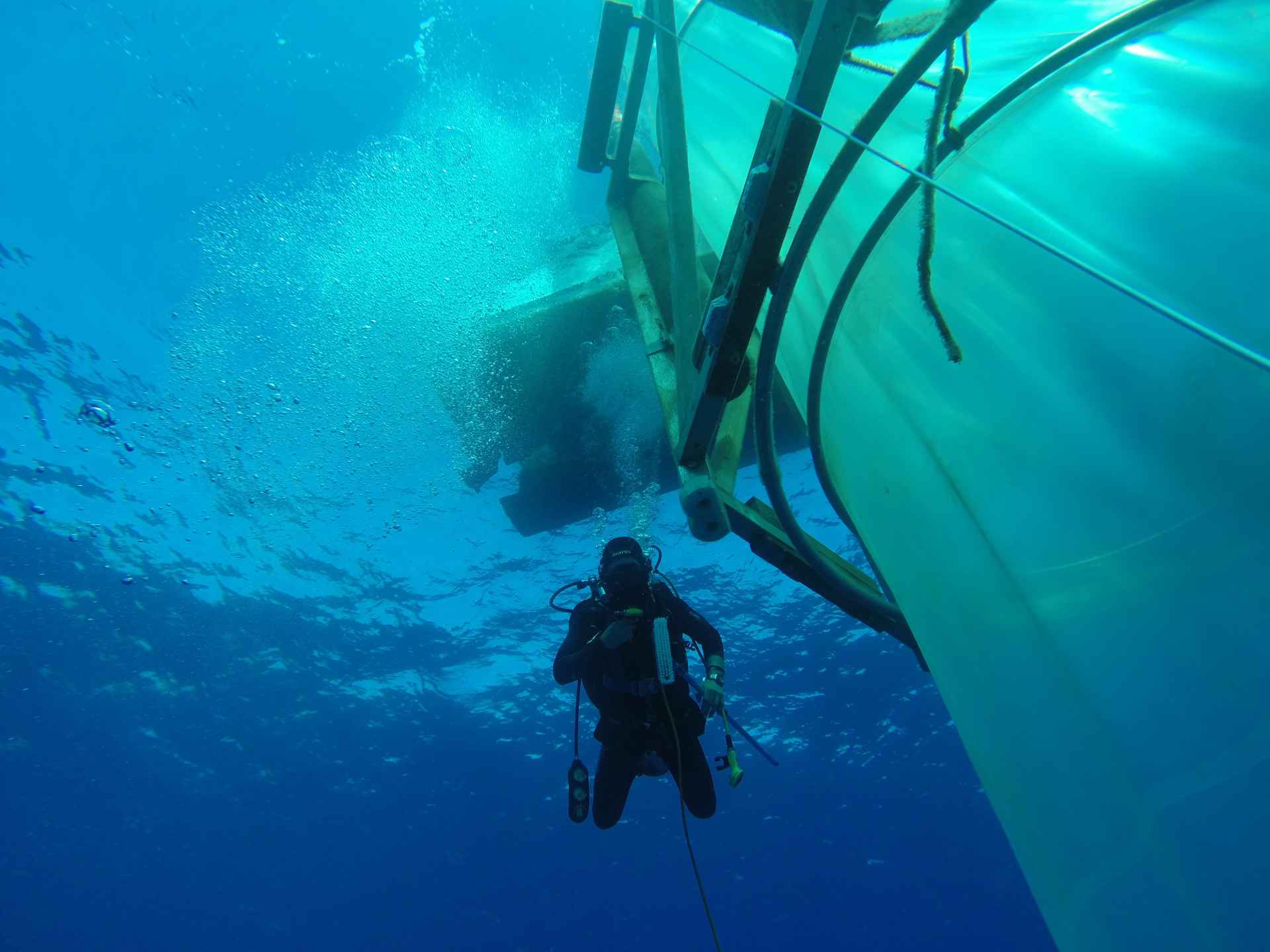 Taucher neben einem Kieler Mesokosmos vor Gran Canaria. In neun dieser Versuchsbehälter wurden zukünftige CO2-Bedingungen simuliert.