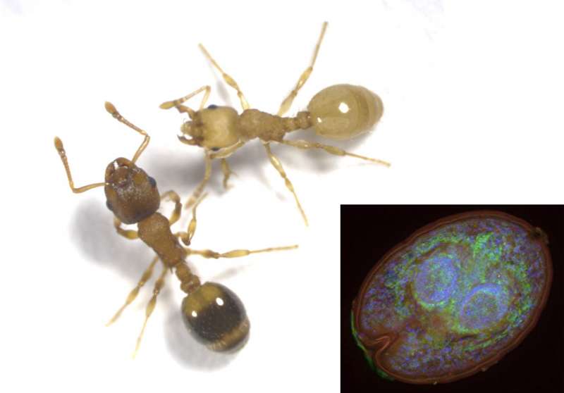 Wie eine mehrjährige wissenschaftliche Studie ergab, zeigen Arbeiterinnen der Ameisenart Temnothorax nylanderi bei einer Bandwurminfektion außergewöhnlich hohe Überlebensraten. „Die Lebenserwartung der infizierten Ameisen ist deutlich verlängert. Die Arbeiterinnen haben nach unseren Beobachtungen eine Überlebensrate, die denen von Königinnen gleicht“, erklärt die Studienleiterin Prof. Dr. Susanne Foitzik von der Johannes Gutenberg-Universität Mainz (JGU). Königinnen können bei dieser Art bis zu 20 Jahre alt werden, während Arbeiterinnen selten das zweite Lebensjahr vollenden. Ein Grund für die höhere Lebenserwartung liegt in einer durch den Parasiten veränderten Physiologie und einer besseren Versorgung der infizierten Tiere.