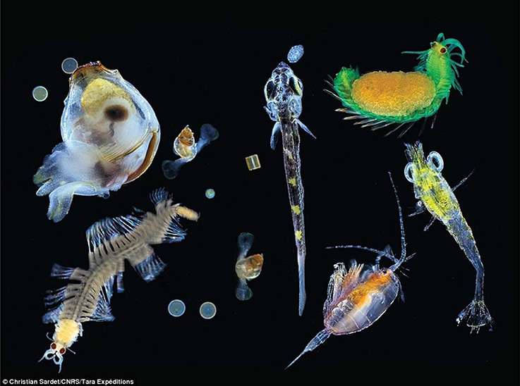 Das Meer ist voller schwebender, mikroskopisch kleiner Lebewesen; diese als Plankton bekannte Lebensgemeinschaft erbringt – so winzig einzelne ihrer Organismen auch sein mögen – wichtige Ökosystemdienstleistungen. So fixiert pflanzliches Plankton (Phytoplankton) durch Photosynthese Kohlenstoff in der Form von CO2 und treibt dadurch den marinen Kohlenstoffkreislauf an. Phytoplankton nährt darüber hinaus das Zooplankton und dieses wiederum dient Fischen und Meeressäugern bis hin zum riesigen Blauwal als Nahrung.