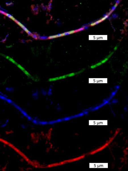 Auch die zweite Hauptperson dieser Geschichte, das Opfer, finden wir in Kläranlagen: Methanosaeta, eine der häufigsten Mikroben der Welt, spielt dort eine entscheidende Rolle. Diese Archaee ist in Kläranlagen hauptsächlich für die Biogasherstellung verantwortlich. Zellen von Methanosaeta leben aneinandergereiht in einem schützenden Schlauch, einem Filament. Harder und sein Team konnten nun in Untersuchungen mit besonderen Farbstoffen und einem Spezialmikroskop nachweisen, dass einzelne Zellen in den Methanosaeta-Filamenten krank oder tot waren. Sie waren erschlafft und enthielten weder ribosomale Nukleinsäuren noch Erbgut – typische Bestandteile lebender Mikrobenzellen. Die Zellen waren vermutlich den Ultramikrobakterien zum Opfer gefallen: „Die Krankheitsverursacher sind aller Wahrscheinlichkeit nach anhaftende Bakterien, und diese anhaftenden Bakterien sind Velamenicoccus archaeovorus-Zellen“, erklärt Harder.