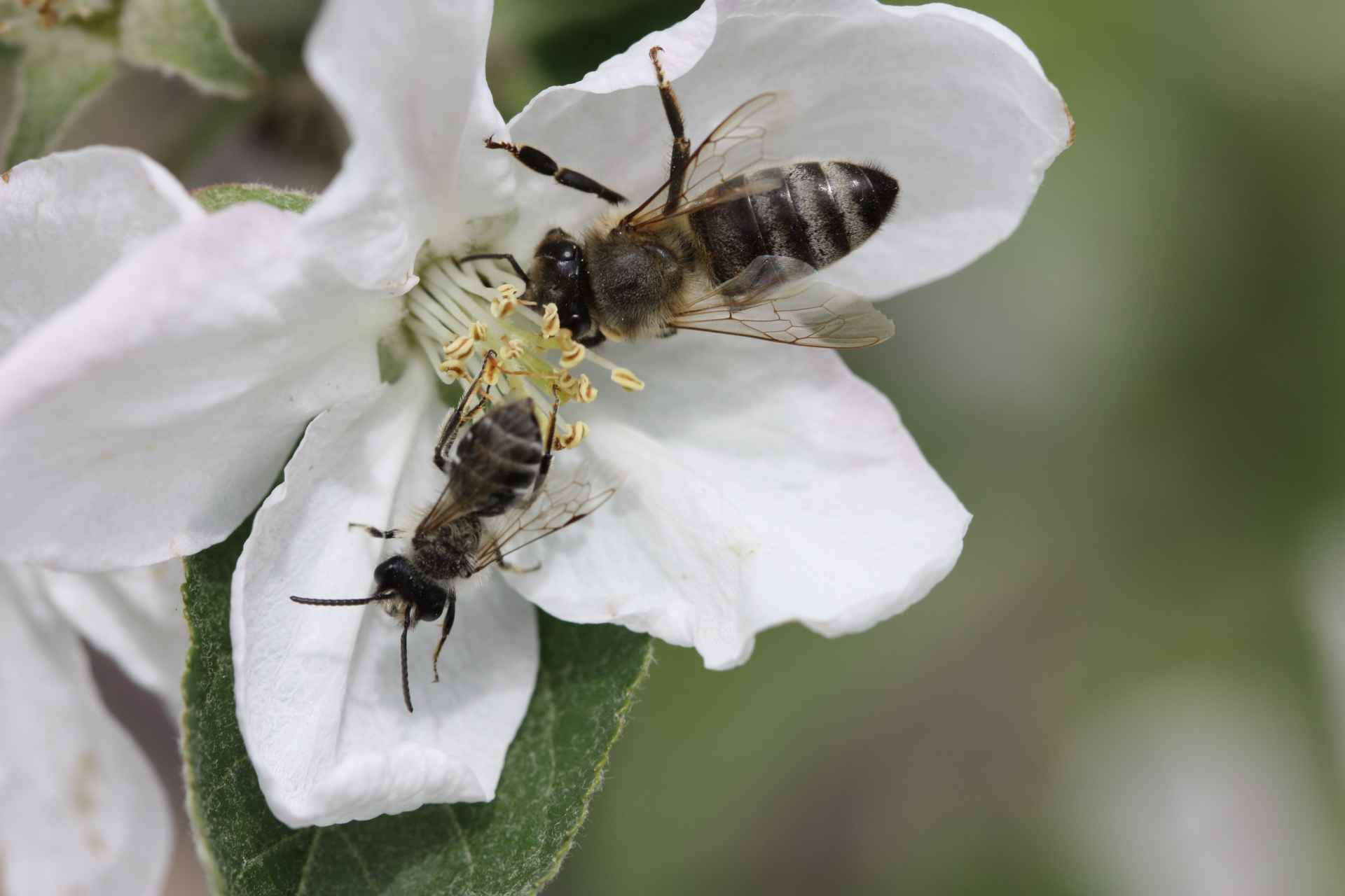 Eine Honigbienenarbeiterin und eine männliche Sandbiene auf einer Apfelblüte