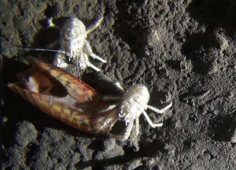 Hydrothermale Quellen am Grund der Ozeane sind Heimat skurriler Lebensgemeinschaften: Zu den Organismen, die an heißen Quellen im Golf von Kalifornien häufig vorkommen, gehören Furchenkrebse der Art Munidopsis alvisca. Ein Tauchgang zu heißen Quellen im Golf von Kalifornien mit dem U-Boot Alvin: Interationales Team untersucht erstmals Mikrobengemeinschaft auf dem Panzer von Tiefseekrebsen.