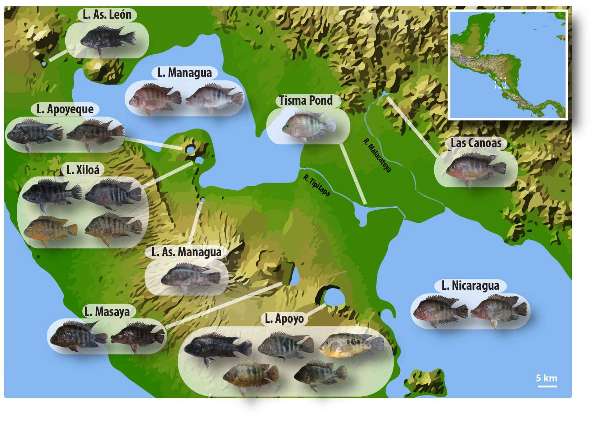 Die Arbeitsgruppe von Axel Meyer forscht nicht nur in den großen Seen Afrikas mit ihrer immensen Vielfalt, sondern auch im Rahmen eines überschaubareren evolutionären „Experiments“: zu den parallelen Artenschwärmen der Midas-Buntbarsche in den zwei großen Seen und mehreren Kraterseen Nicaraguas. Die Wissenschaftler fokussieren dabei auf deren Morphologie, Populationsgenetik und Habitat und vergleichen die Ergebnisse mit denen der Ursprungspopulationen in den großen Seen Nikaraguas. Die Kraterseen sind allein durch ihre erheblich geringere Größe nicht nur weniger komplex, sondern haben auch den Vorteil, dass ihr maximales Alter bekannt ist. Sie sind mit zwischen 1.000 und 24.000 Jahren evolutionär sehr jung, was nochmals mehr Übersichtlichkeit garantiert.