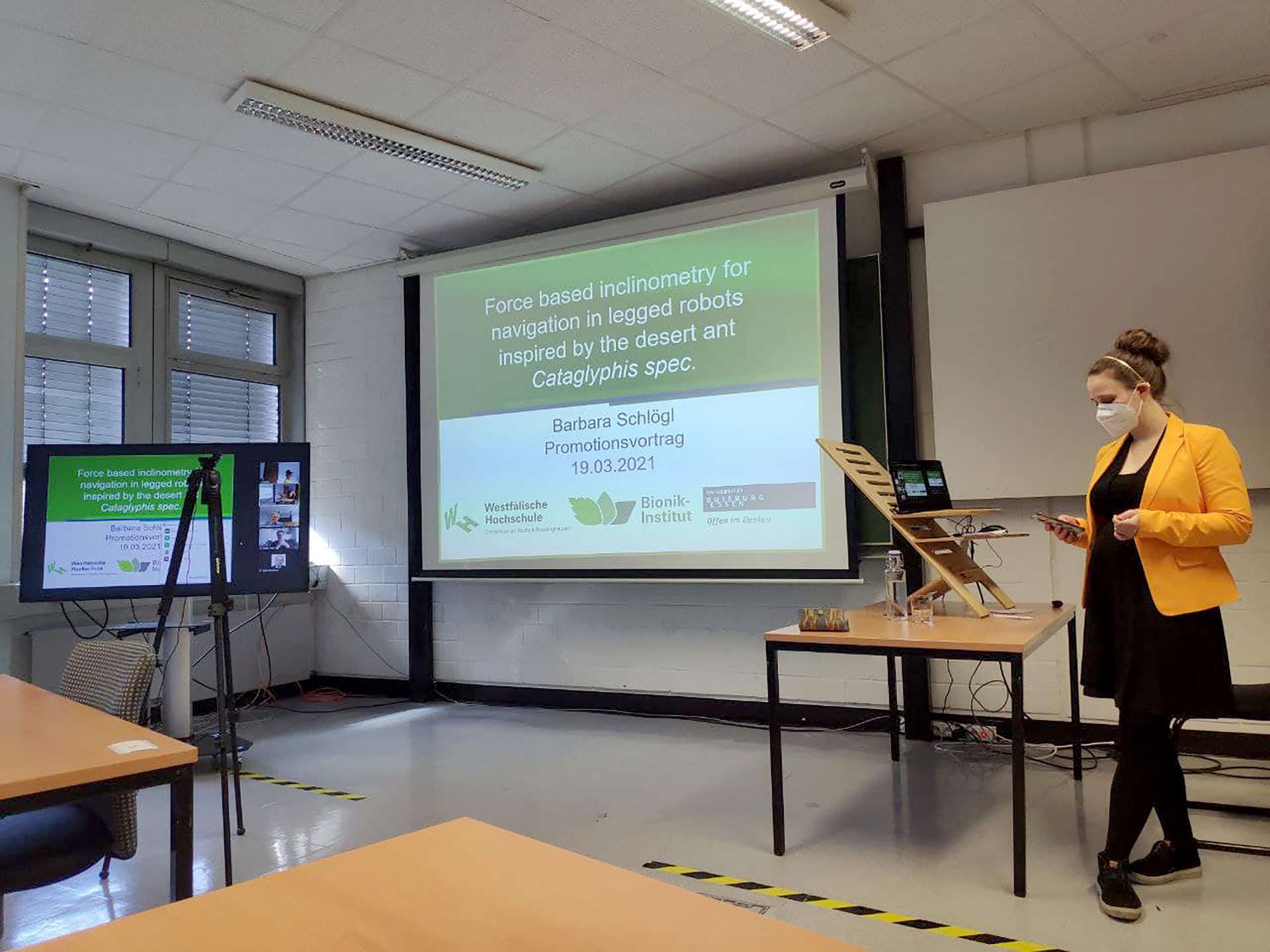 Barbara Schlögl hat im Westfälischen Institut für Bionik der Hochschulabteilung Bocholt eine Doktorarbeit geschrieben, in der sie der Wüstenameise Cataglyphis deren Fähigkeit abgekuckt hat, sich im Raum zu orientieren. Das hat sie auf Laufroboter übertragen.