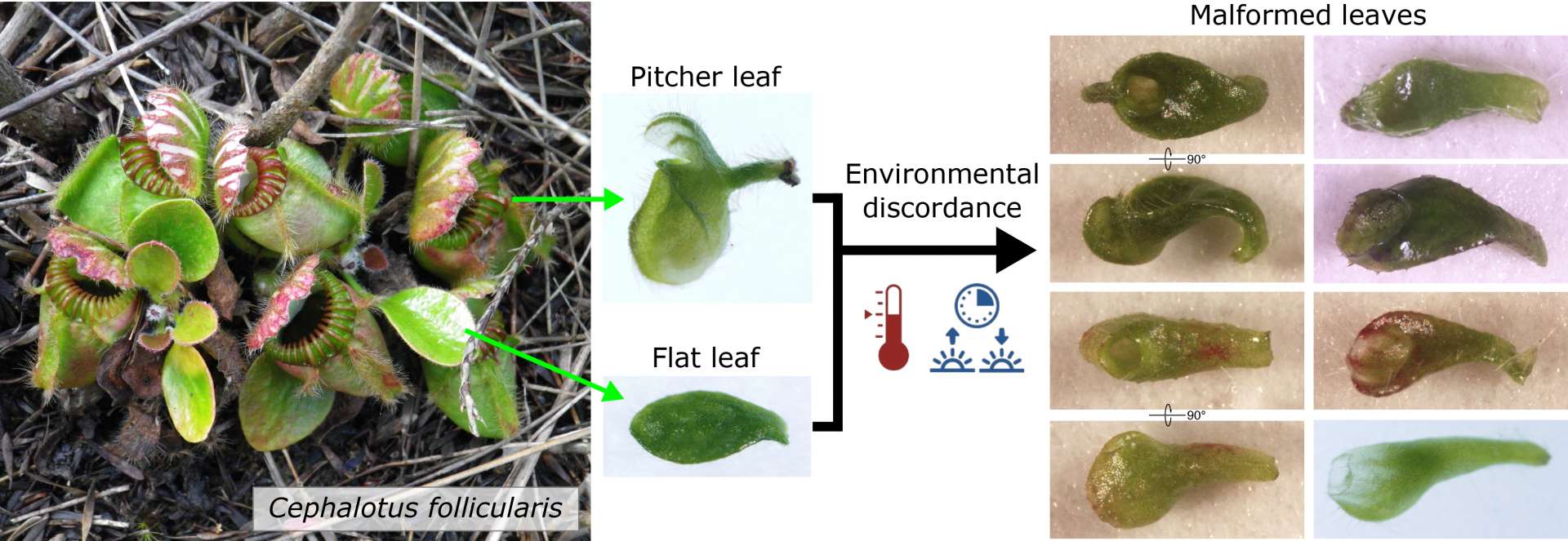 Ein internationales Forschungsteam zeigt nun im Journal Proceedings of the Royal Society B, welche Vielfalt an missgestalteten Blättern die fleischfressende australische Kannenpflanze Cephalotus follicularis bilden kann. Um diese versteckten Reaktionsnormen hervorzukitzeln, ließen sie die Pflanzen zwölf Wochen lang unter unterschiedlichen Bedingungen in Klimakammern wachsen.