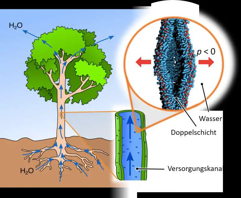 Mittels Unterdruck saugen Pflanzen Wasser aus der Erde. Weshalb der Wert des Drucks dabei etwa 100 bar nicht unterschreitet, war bislang ein ungelöstes Rätsel. Eine interdisziplinäre und internationale Forschergruppe berichtet nun, dass offenbar so genannte Lipidaggregate in den Pflanzensäften für das Phänomen verantwortlich sind. Simulationen und Modellrechnungen zeigen, wie sich auf Grund der Lipide wachsende Hohlräume bilden, die die Flüssigkeitssäule bei zu großen Unterdrücken abreißen lassen.