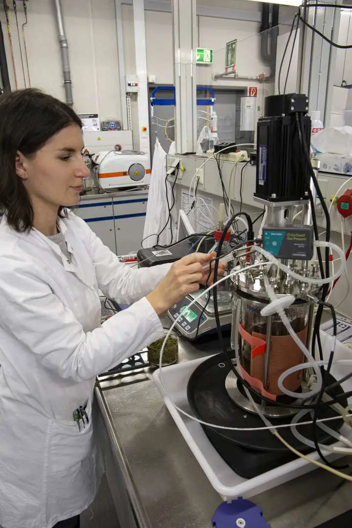 Im Labor arbeitet Doktorandin Berit Rothkranz gerade daran, die Parameter zu optimieren. Sie erforscht, welchen Einfluss pH-Wert, Temperatur und Druck auf die Fermentation haben. „Wir müssen die Apparate umrüsten, weil eine höhere Temperatur als in herkömmlichen Reaktoren anliegt“, sagt die Nachwuchsforscherin. Die Zusammensetzung des entstehenden Gasgemischs und damit die Prozessqualität untersucht sie mit einem Chromatographen.