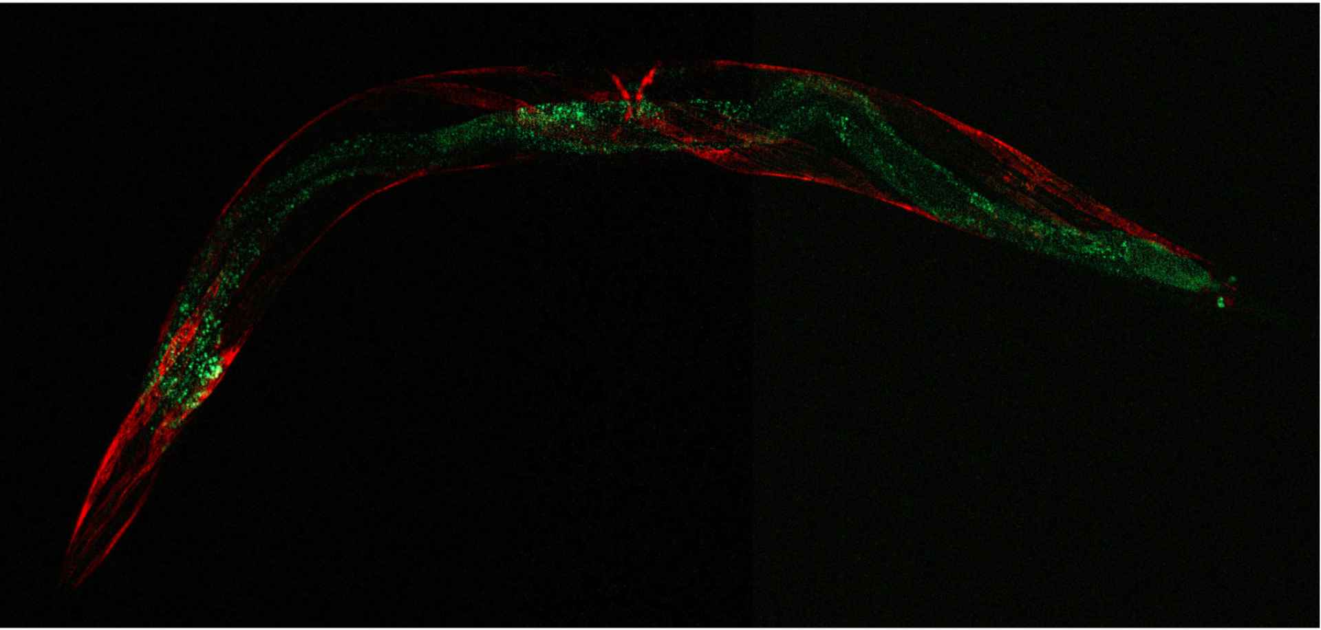 Der Fadenwurm C. elegans kommt aus verschiedenen Gründen häufig in der Alternsforschung zum Einsatz: Er ist ein multizellulärer Organismus mit einem kurzen Lebenszyklus und einer durchschnittlichen Lebensdauer von 15-20 Tagen. Sein Genom ist vollständig sequenziert und mehr als 60 Prozent seiner Gene haben die gleiche Struktur und Funktion wie menschliche Gene. Der Wurm ist mit einer Länge von 1 mm sehr klein, transparent und hat gut charakterisierte Phänotypen (Erscheinungsbilder) und Verhaltensweisen. Erstaunlicherweise finden sich einige mit dem Alter verbundene Merkmale, die im Menschen beobachtet werden, auch in C. elegans wieder: Mit dem Alter bilden sich Gewebe zurück, physiologische Funktionen und Stressresistenz lassen nach und die Sterbewahrscheinlichkeit nimmt zu. Diese evolutionär konservierten Eigenschaften können in C. elegans unter dem Mikroskop untersucht werden, um die Effekte von genetischen Einflüssen und Umwelteinflüssen auf den Alterungsprozess zu erforschen und wichtige Erkenntnisse für die menschliche Gesundheit zu erlangen.