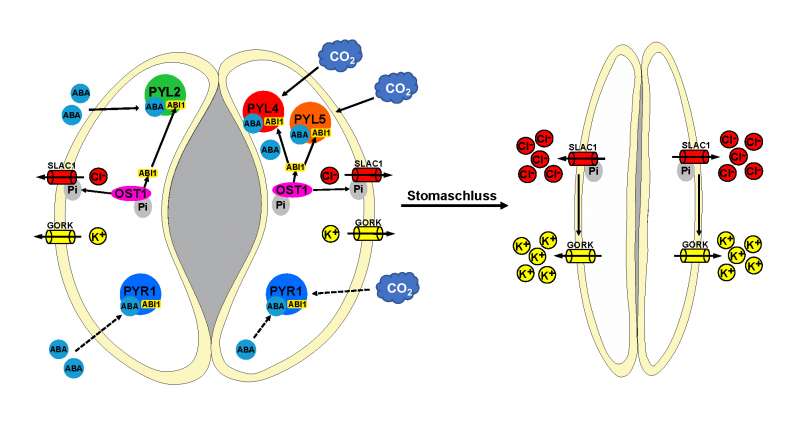 Die Wasserversorgung wird über ein Hormon gemessen. Bei Wassermangel bilden Pflanzen das Welkehormon Abscisinsäure (ABA) und versetzen ihren CO2-Regelkreis in den Wassersparmodus. Das läuft ebenfalls über die Schließzellen, die auch Rezeptoren für ABA haben. Steigt die Hormonkonzentration im Blatt an, gehen die Poren zu.