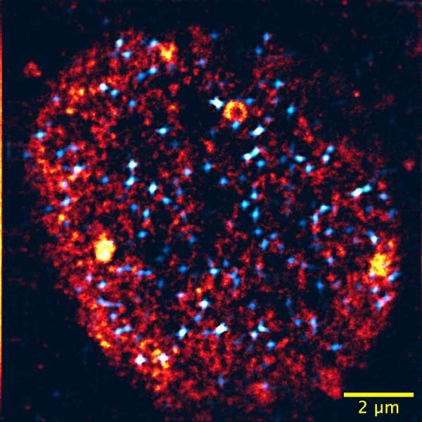 Mikroskopiebild eines Zellkerns: Transkriptionsfabriken in Orange, aktivierte Gene in Hellblau. Der Zellkern misst circa ein Zehntel der Dicke eines menschlichen Haares. (Abbildung: Arbeitsgruppen Nienhaus und Hilbert, KIT)