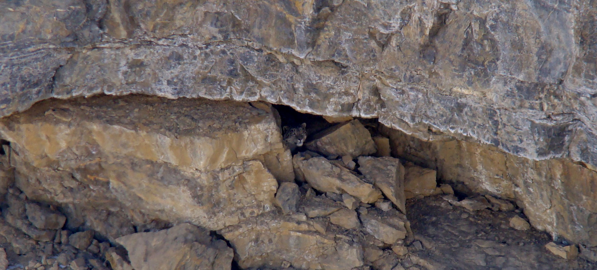 Wild lebender Schneeleopard / Wer findet die Katze? Bitte vergrößern.