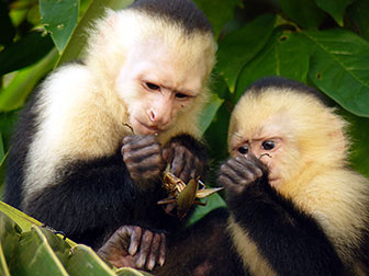 Unter Weißschulterkapuzinern (Cebus capucinus) ist die soziale Kommunikation sehr wichtig. Die Affen verbringen viel Zeit, um sozialen Bindungen und Vertrauen herzustellen. Ein Beispiel ist besonders kurios: ein Affe steckt seinen Finger in der Nase des anderen und der andere Affen wiederholt diese Tätigkeit. Dies kann mehrere Minuten dauern und ist von einem trance-ähnlichen Ausdruck begleitet. Manchmal saugen sie gegenseitig an ihren Fingern. Weißschulterkapuziner (Cebus capucinus) spielen auch unter Zuhilfenahme des Mundes, indem ein Individuum etwas in den Mund legt, sei es der Finger eines anderen Affen, ein Stück Fell oder ein anderer Gegenstand. Ziel des Spiels ist es, den Gegenstand aus dem Mund des anderen herauszubekommen. Dann legen sie das Objekt entweder zurück in den Mund, um ein neues Spiel zu beginnen, oder sie tauschen die Rollen. [10][14][16].